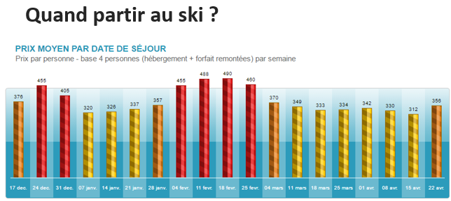 Comme chaque année, les périodes hors vacances scolaires restent les plus attractives. Ainsi, la semaine du 7 janvier est proposée à des prix défiant toute concurrence avec un prix moyen de 320 € par personne (hébergement + remontées mécaniques), et on peut trouver des séjours ski tout compris dès 106 €/pers à Gresse en Vercors dans les Alpes du Nord.
