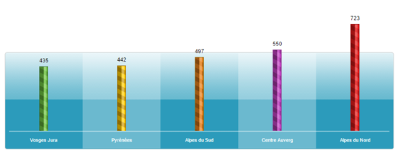 Cette année, ce sont les stations des Vosges et du Jura qui proposent les tarifs les plus bas, avec un prix moyen de 435 € par appartement (4 personnes). A titre de comparaison, c’est 60% moins cher que de louer un appartement dans les Alpes du Nord (723 €). Ces prix moyens sont de 442 € dans les Pyrénées, 497 € dans les Alpes du Sud et 550 € en Centre Auvergne.